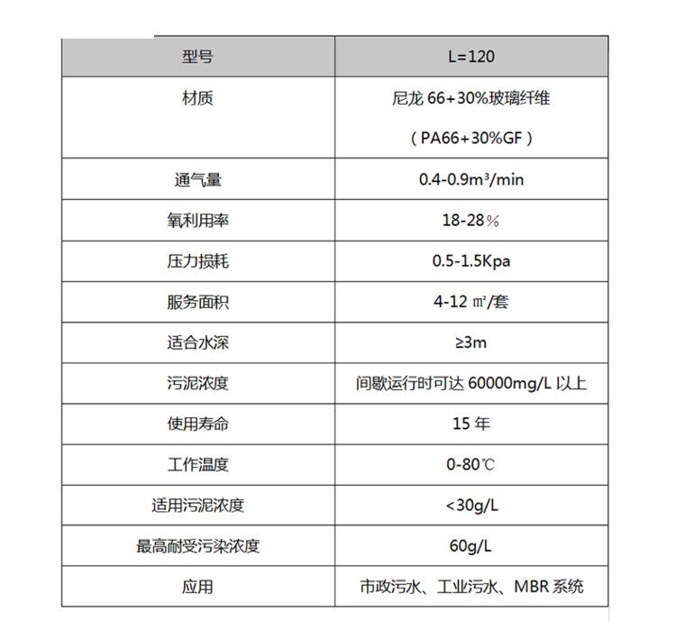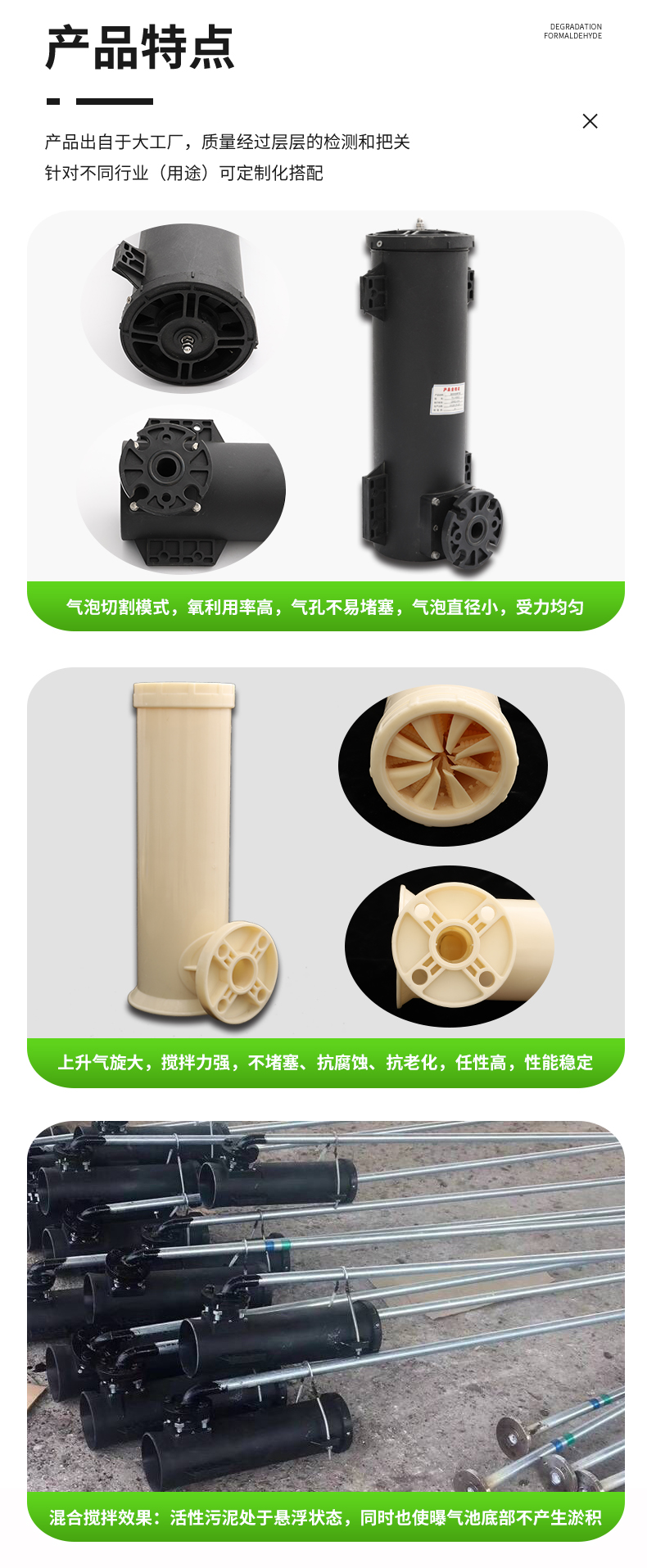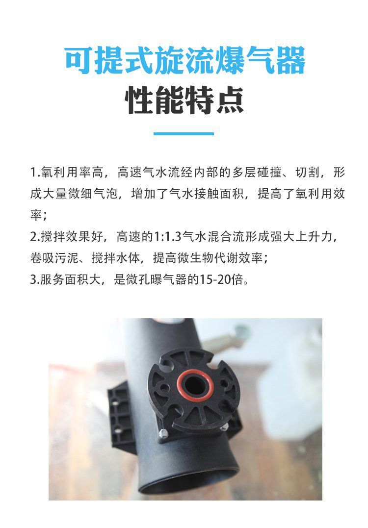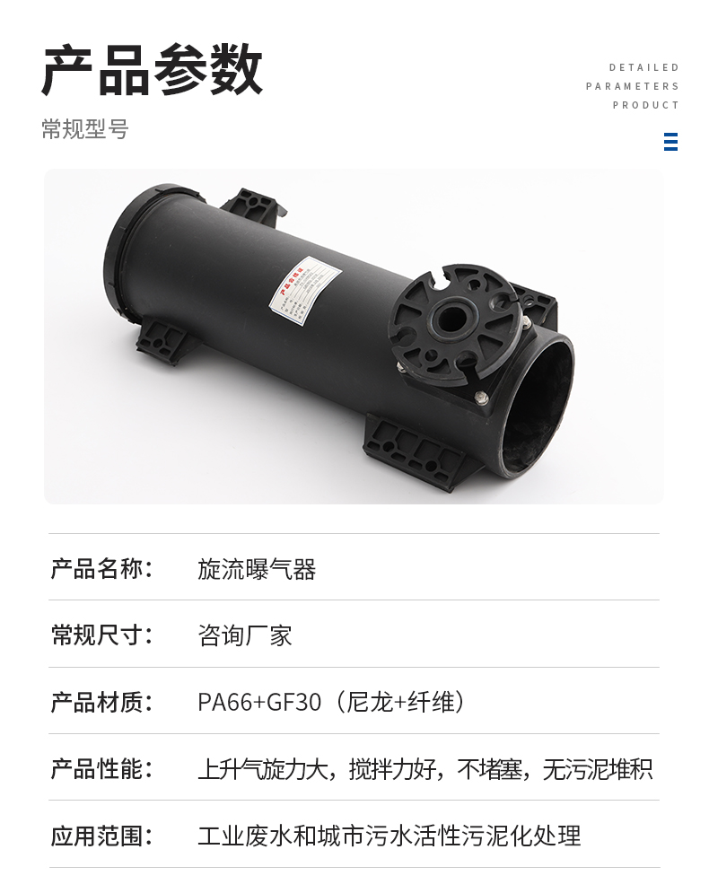 旋流曝氣器主要由外筒、進氣管、回流板、楔形結構四部分組成,可提升旋流曝氣器溶氧效率高,壓力損失小,攪拌能力強,不堵塞,池底不積泥,,免維護,間歇運行,使用壽命長;與傳統的螺旋曝氣器、發散式曝氣器、穿孔管曝氣器相比,可升降旋流曝氣器的能耗可降低25%以上。 可升降旋流曝氣器整體由尼龍66+30%玻璃纖維制成,,具有較高的耐腐蝕性。其高度為42厘米,內徑為12厘米,進氣口中心距曝氣頭底部5厘米。