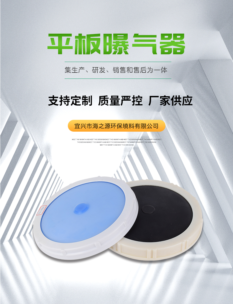 平板膜片曝氣器,該裝置曝氣氣泡直徑小,氣液界面直徑小,氣液界面積大,氣泡擴散均勻,不會產生孔眼堵塞,耐腐蝕性強,經上海同濟大學環境工程學院和中國市政工程華北設計院進行清水和污水充氧測試,并經50多家用戶多年使用效果良好(比常規產品固定螺旋曝氣器,散流曝氣器和穿孔管曝氣器能耗降低40%,或增加污水處理量40%)。特別適用于城市污水和大型工廠新建擴建和老曝氣池改造,且曝氣池可間歇運行。