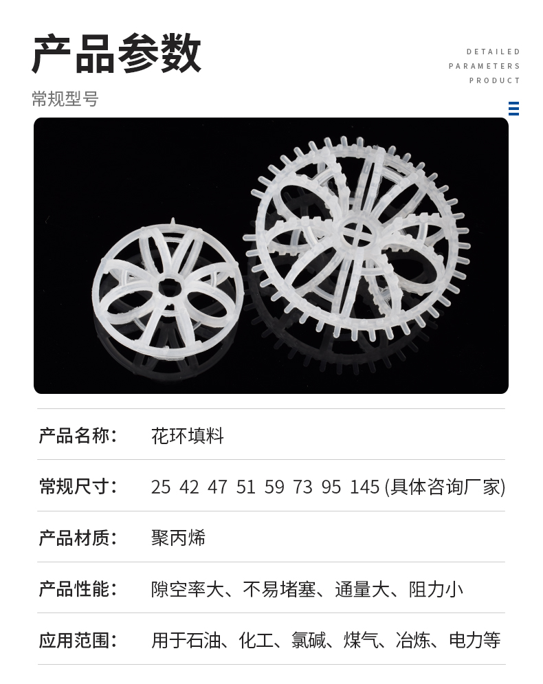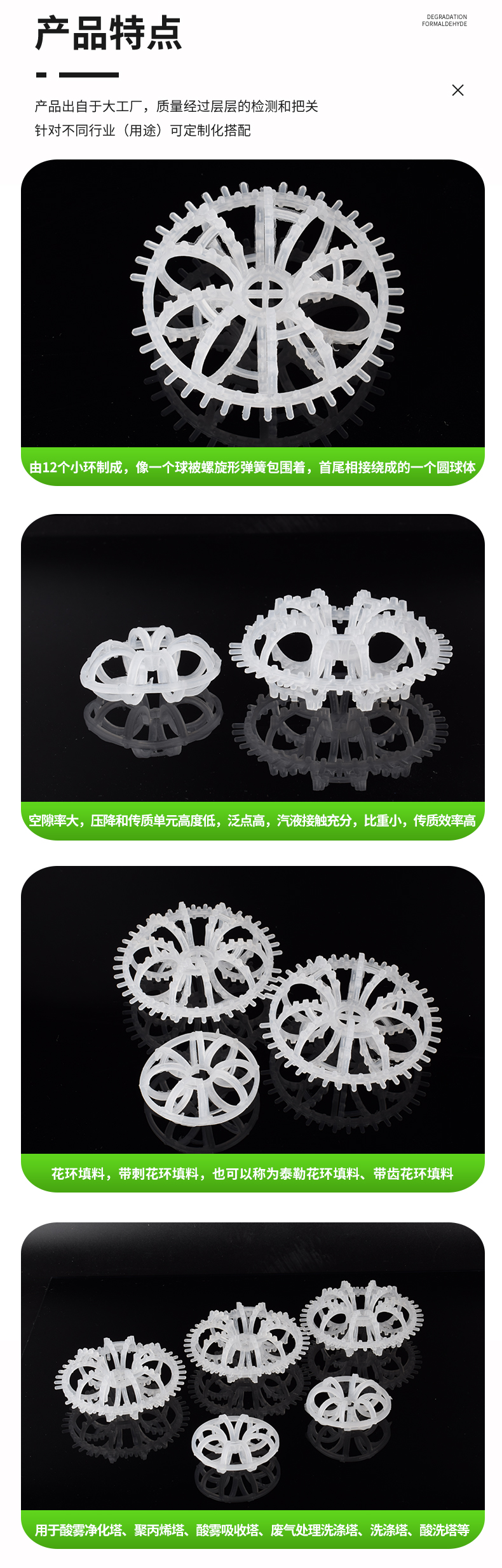 花環(huán)填料也稱(chēng)梅花環(huán)填料是由許多圓環(huán)結(jié)繞而成,由于這種填料的間隙處能有較高的滯液量,可使塔內(nèi)液體停留時(shí)間較長(zhǎng),從而增加了氣液的接觸時(shí)間,提高了填料的傳質(zhì)效率。具有空隙率大,壓降和傳質(zhì)單元高度低,泛點(diǎn)高,汽液接觸充分,比重小,傳質(zhì)效率高等特點(diǎn),多用于氣體洗滌、凈化塔中。