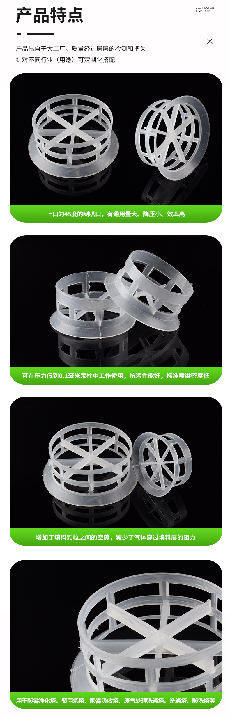 由于階梯環填料的側端增加了翻邊,不但可以增加填料環的機械強度,而且由于破壞了填料結構的對稱性,因而增加了填料投放時的定向幾率。又由于翻邊的影響,使得填料在堆積時填料環隙之間的接觸由此線性接觸為主變為以點接觸為主。這樣,不但增加了填料顆粒之間的空隙,減少了氣體穿過填料層的阻力,而且這些接觸點還可以為液體沿填料表面流動的匯聚分散點,從而促進了液膜的表面更新,有利于填料傳質效率的提高。